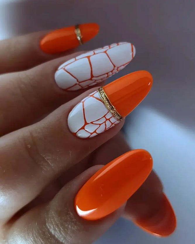 Combining the crispness of white with the vibrancy of orange, this design features a stunning cracked pattern that is both edgy and elegant. The White and orange contrast beautifully, with a single gold band adding a luxurious finish. This set would be perfect for both casual outings and more upscale events, providing a modern twist on the classic orange nail.