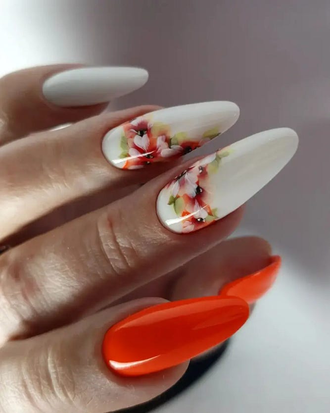 Here we see a softer side of summer with delicate floral patterns adorning a white base, paired with vibrant orange tips. This design speaks to the romantic and the dreamer, perfect for a summer date or a leisurely stroll through the city. The with flowers motif adds a touch of nature’s beauty, making it an ideal choice for those who appreciate the finer things in life.