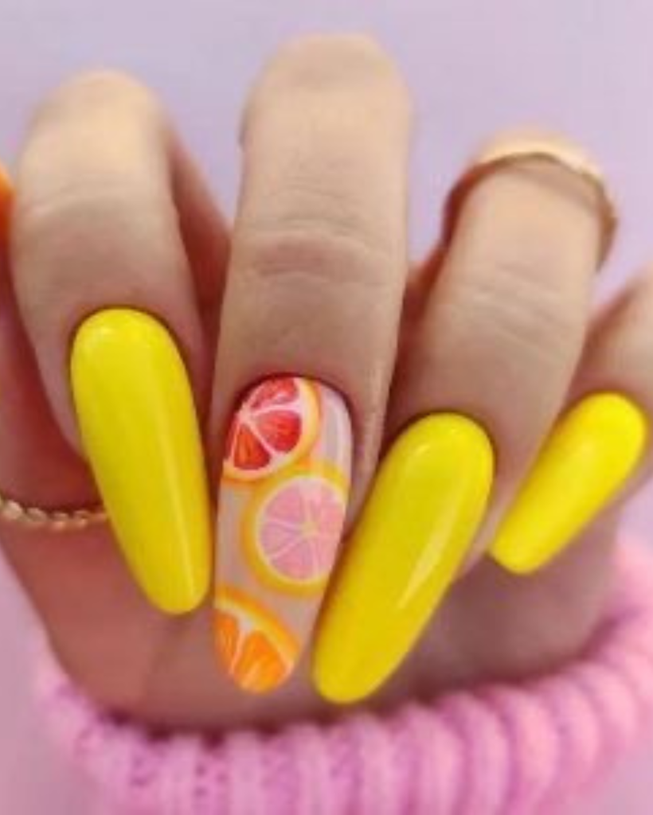 Bold and bright, this nail art is like a sip of lemonade for your fingertips. The long nails are coated in a vivid yellow, capturing the trend of 2024 color excellence. A single accent nail features a detailed design of citrus slices, making it a refreshing twist on the trending acrylic styles. These nails are a perfect match for a playful day dress or a casual beach outing.
