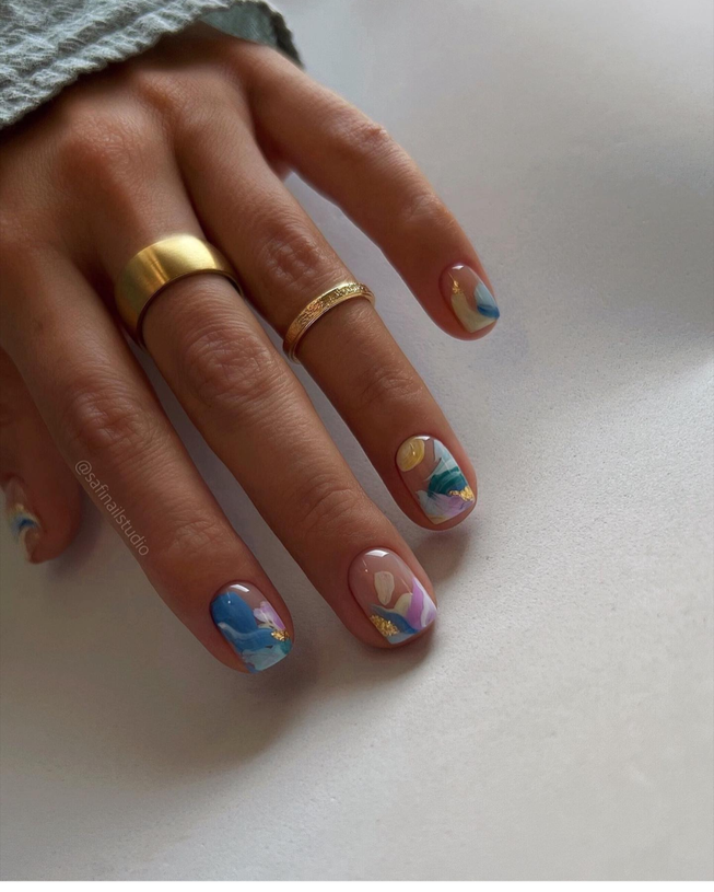 This trendy nail design features abstract shapes in a harmonious color palette that hints at modern art influences. It’s a bold and creative expression for those who admire an aesthetic that stands out while remaining simple and elegant.
