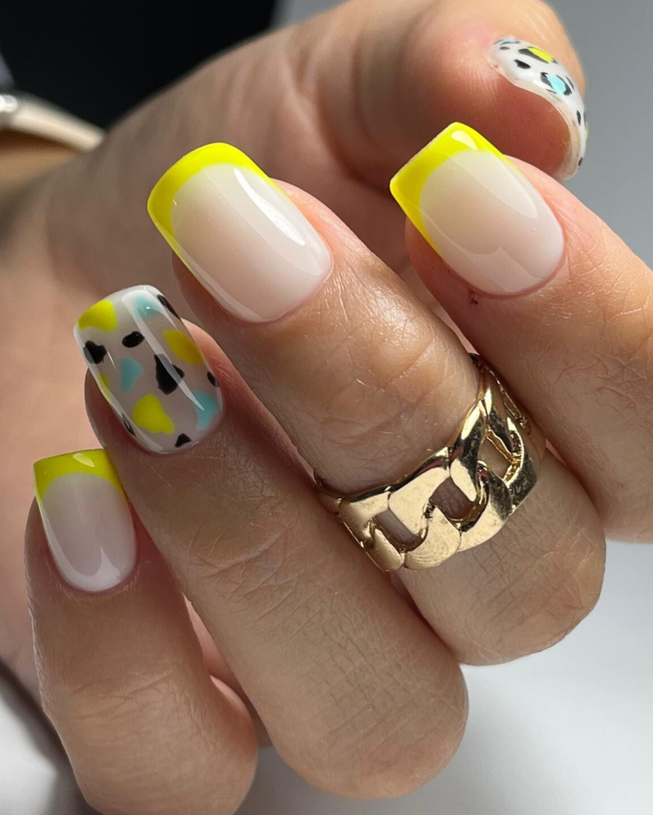 As a nod to the art 2024 movement, these nails are a canvas for expressing individuality and playfulness. The combination of short and long lengths within the set caters to the practicalities of everyday life while embracing the trends of the season. Bright yellow tips, complemented by abstract black and blue spots, channel the pop art era into a modern 2024 narrative. This design is perfect for those who aren’t afraid to stand out and make a statement.
