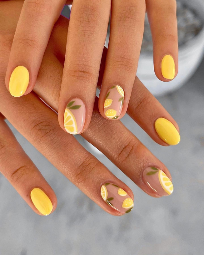 Here we see a delightful play on the classic short nail, with alternating nails painted in a sunny yellow and transparent pink adorned with lemon and leaf designs. This simple yet playful look is a trend that speaks to lazy afternoons and picnics in the park, making it a perfect choice for those who love a trending aesthetic with a touch of whimsy.