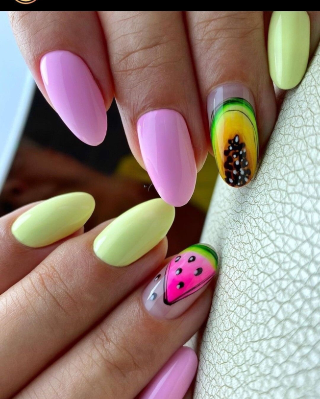 Sweet and irresistible, this watermelon-inspired design is a summer favorite. The alternating pink and pale yellow hues create a soft, pastel base, while the feature nails boast a juicy watermelon slice complete with tiny black seeds. This trending nail art design brings a slice of the beach to your everyday look, blending color and creativity.