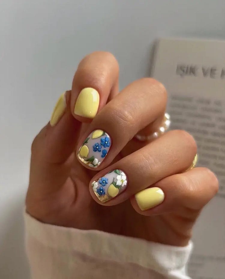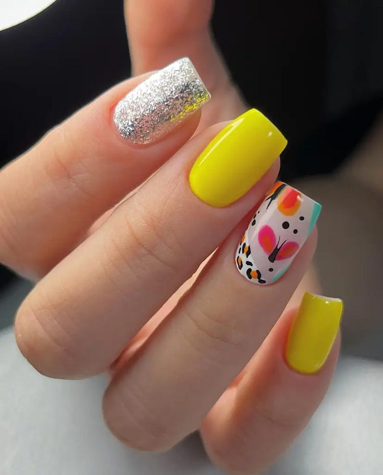 Capture the essence of sunny days with these bright yellow nails, sparkling with a touch of gold glitter. This look is all about standing out and shining like the summer sun itself. Perfect for festivals or days when you want to feel a little extra glamorous.