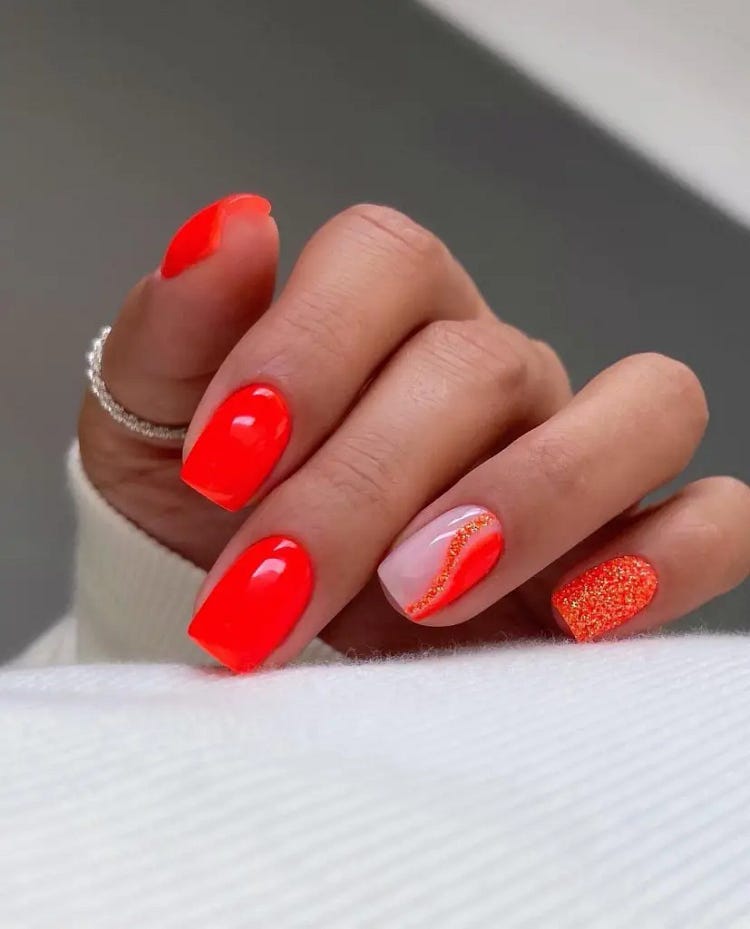 Imagine your nails dipped in the essence of summer with a delightful fusion of yellow and orange. This design is reminiscent of citrusy delights, with a sunny yellow base and playful orange accents. It’s a bold statement that pairs perfectly with a white summer dress or denim.