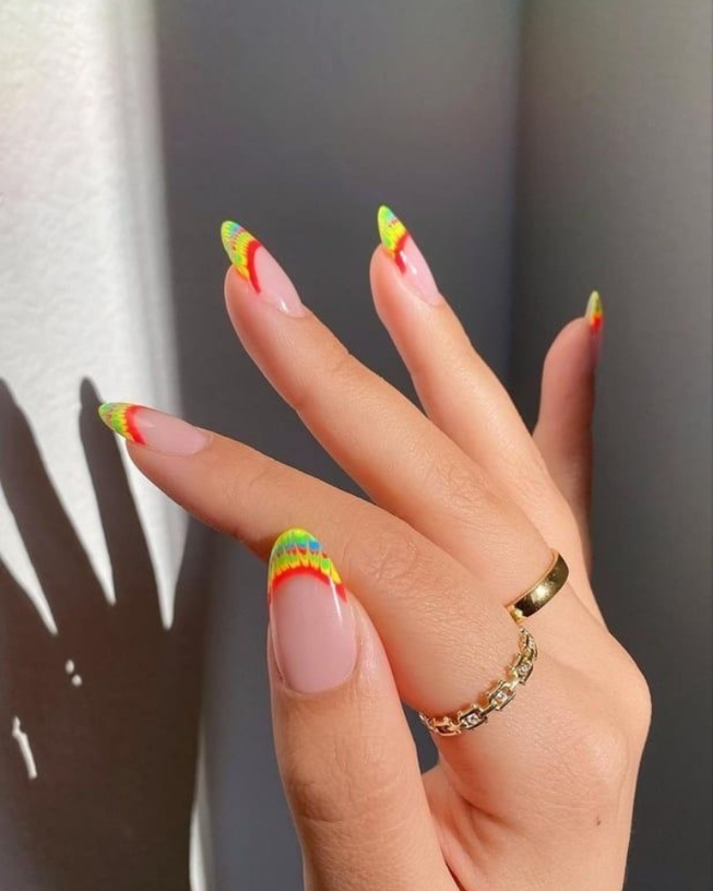 For those who adore a hint of neon, this design offers the perfect balance. The majority of the nail boasts a light, natural polish, allowing the bright neon tips to truly shine. It’s a simple, understated approach to summer nails that still captures the essence of fun in the sun. These short nails are a cute nod to the classic French manicure with a modern, fluorescent twist, ideal for accentuating a sun-kissed look.