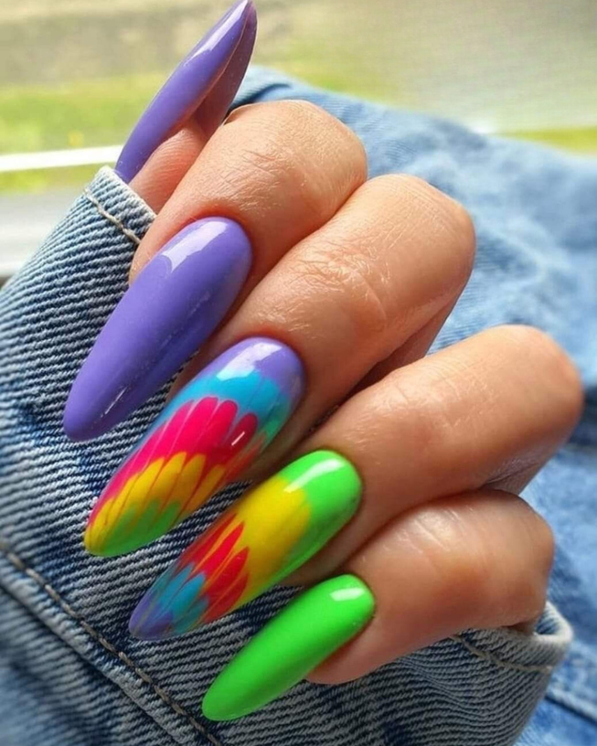 The tie-dye trend has circled back into fashion’s favor, and it’s not hard to see why. With its vibrant colors blending into one another, this design is a nod to the free-spirited vibes of the ’60s and ’70s. These acrylic nails are for those who love to make a bold statement. The longer length provides a great canvas for the colorful designs, making it a bright choice for those summer music festivals or just hanging out with friends.