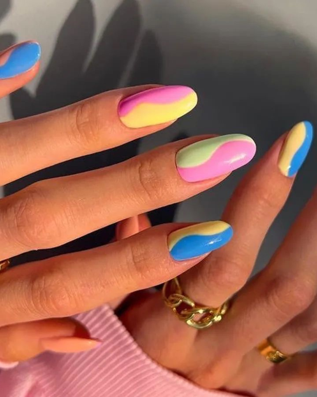 For those who prefer a whisper of color, these pastel swirls offer a dreamy vibe that’s both light and simple. The interplay of pink and green swirls over a solid base exudes a soft, calming effect. It’s an acrylic design that pairs beautifully with flowing summer dresses and lightweight fabrics. Ideal for both short and long nails, this style is versatile and understated — a perfect choice for the woman who embodies the gentle breezes of summer.
