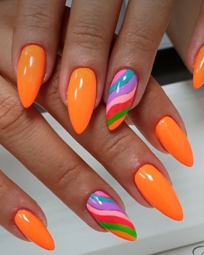 Welcome to the tropics, where the sunsets are as bright as the fashion. This design features a solid neon orange that radiates summer heat. The vibrant color is perfect for any skin tone, adding a warm glow especially for brown skin. One nail breaks the mold with a rainbow of stripes, offering a cute and creative splash amidst the orange allure. The acrylic long nails are the perfect canvas for this bold statement, sure to turn heads and spark conversations.