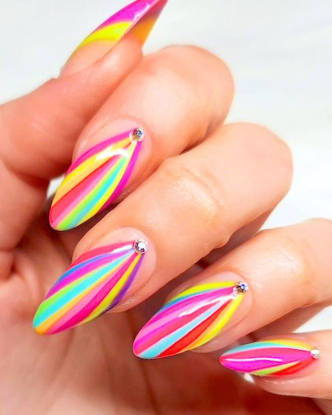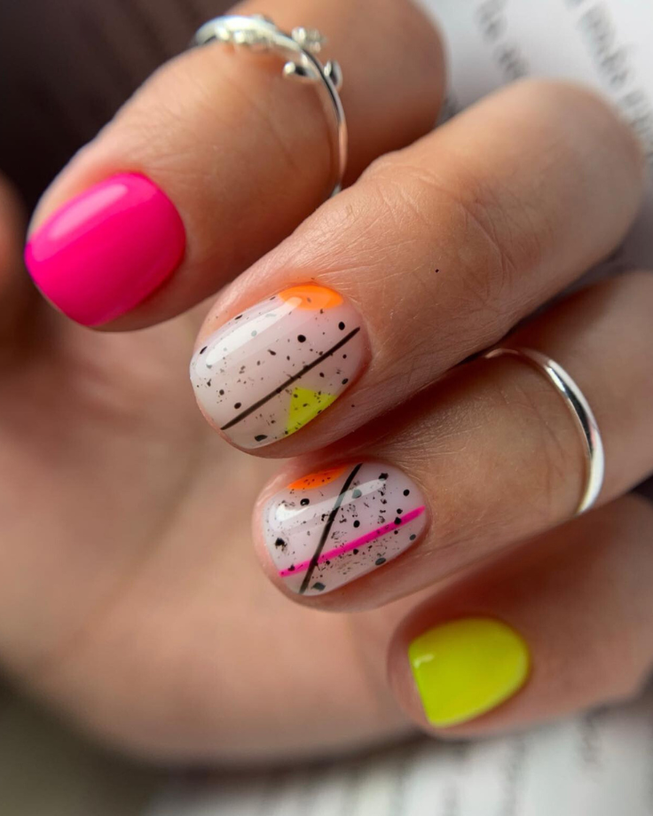 The minimalist movement finds its way to nail design with this understated yet striking look. The light base is accentuated with abstract lines in a combination of soft, pastel colors and a bright neon punch. The design is unassuming but bold, a simple statement on short nails that’s both cute and chic. It’s a versatile style that can be dressed up or down, complementing any summer outfit with a hint of artistic flair.