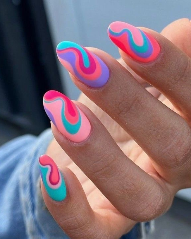 Retro waves are making a splash in the summer of 2024. These nails capture the playful spirit of the ’70s with wavy lines of blue, pink, and purple. The short nail length makes this design as practical as it is stylish, providing a simple yet bright pop of color. It’s an ideal choice for those who prefer a soft, gel-polished look with an edgy twist. Pair these nails with your favorite denim to complete the throwback vibe.