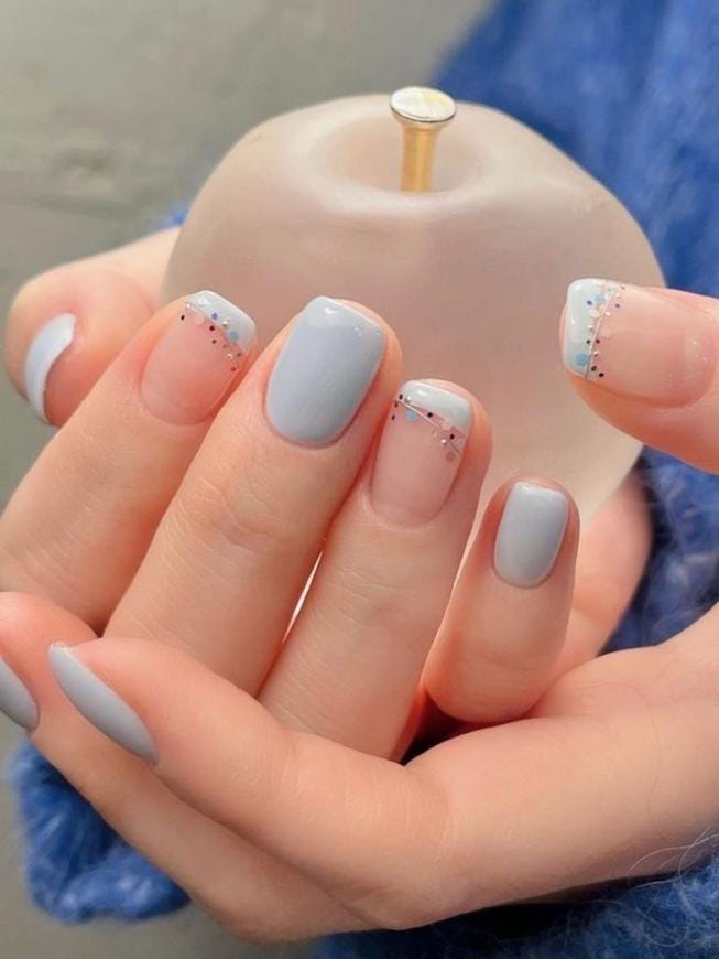 The cool slate grey of these square nails is a sophisticated and simple choice, exuding a chic urban vibe. The playful confetti accents on the tips add a dash of fun, suggesting the sparkling joy of summer parties. This design bridges the gap between the laid-back holiday feel and the sleek elegance of city life.