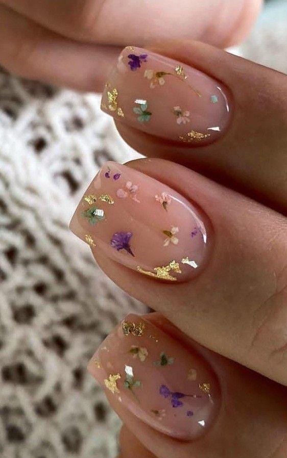 The whisper of lilac on these almond-shaped nails sets a tranquil tone for the summer. The addition of golden flakes amidst the floral designs offers just the right amount of shimmer, suggesting luxury in subtlety. This nail art is for the woman who adores simple elegance but also appreciates a sprinkle of glamour in her ideas for summer chic.
