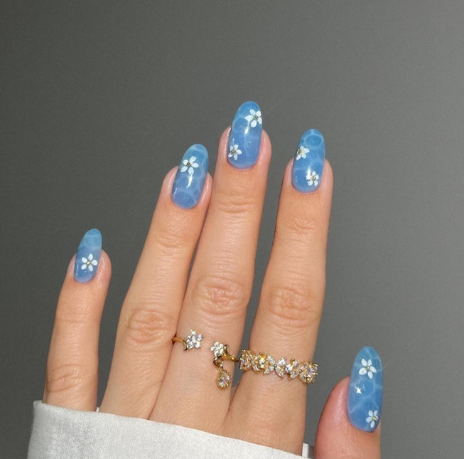 Soft blue gradients paired with simple pink flowers create a sky-inspired design that speaks to the soul of summer. These almond-shaped nails are like a breath of fresh air, perfect for those who carry the serenity of the summer sky wherever they go.