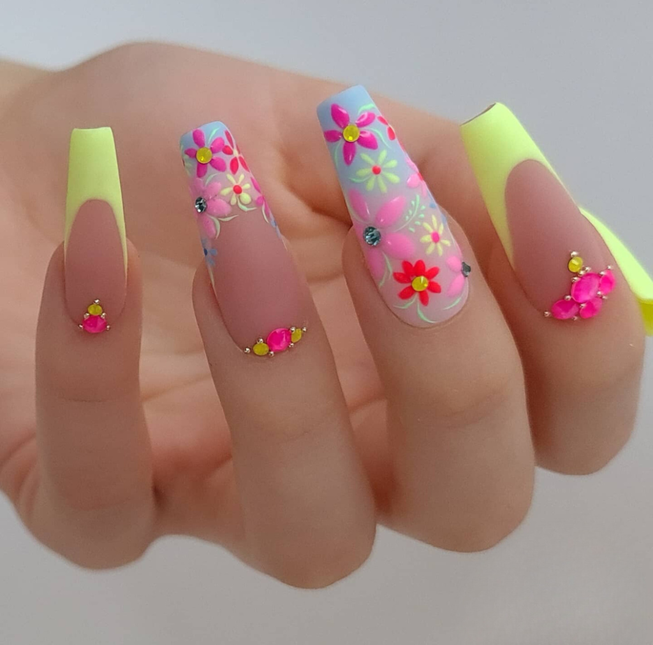 Neon yellows and pastel pinks come together to create a design simple that’s both electrifying and cute. The bright blooms and crystals on a neutral base make these almond-shaped nails stand out. Ideal for a night out or a festive summer party, these nails are sure to be the center of attention wherever you go.