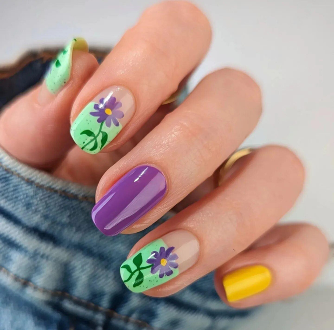 This playful array of short nails captures the whimsical side of summer with its vibrant display of purple and yellow flowers. Each nail tells a story of blooming meadows and warm, sunlit days. The creativity in this design simple yet cute approach makes it a delightful choice for those leisurely picnics in the park or spontaneous road trips with friends.