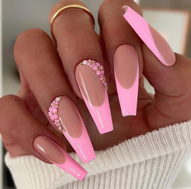 The romance of a summer sunset is captured on these nails, with a gradient of pink giving way to a floral pattern that feels both classy and trending. This design is ideal for those balmy evenings by the beach or a candlelit dinner under the stars. It’s a design pink that tells a story of summer love and cherished moments.