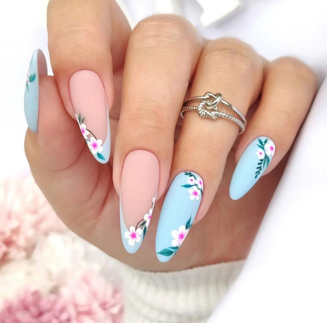 Echoing the soft pastel skies of dawn, these almond-shaped nails bring a breath of fresh air with their pink and blue hues. The simple floral design is delicately placed, creating a cute and classy statement that is both subtle and trending. These nails would beautifully complement a light summer dress, embodying the grace and beauty of the season’s first light.