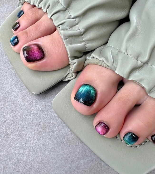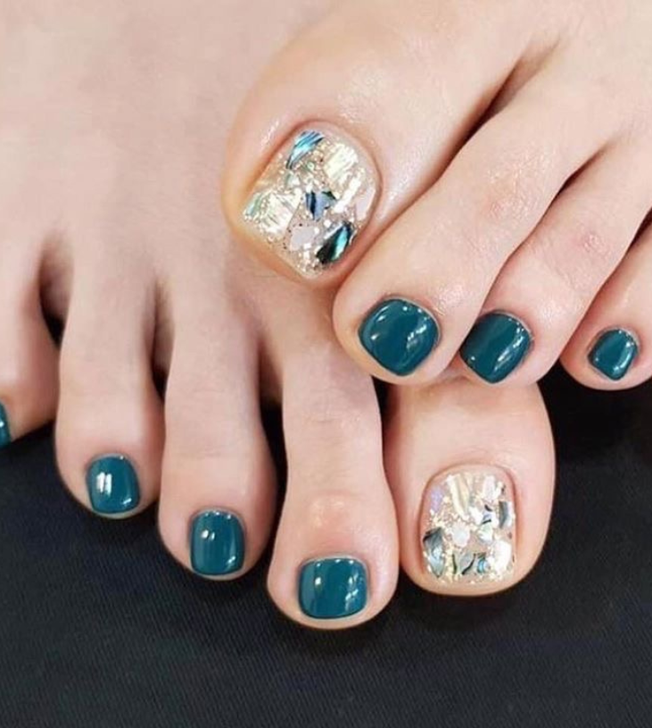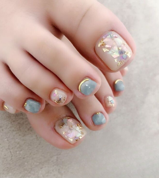 Imagine your toes dipped in the opulence of a starry night sky. Here, the glitter and sparkle of fragmented jewels play with light, while the matte finish of a deep blue sky creates a mesmerizing contrast. The full set of toenails is adorned with generous pieces of iridescent material, reminiscent of precious stones. Each nail is a testament to the idea that the night’s beauty can be captured right at one’s feet.
