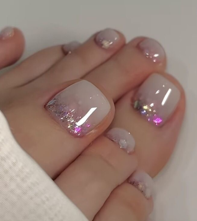 Wrapped in the soft embrace of tulle, these toenails are a fairytale come to life. Lavender hues mingle with the glint of large, shimmering flakes, creating a sparkle that rivals the morning dew. Smaller toes twinkle with a glitter reminiscent of a sprinkling of fairy dust. The designs echo a magical realm where elegance meets enchantment.