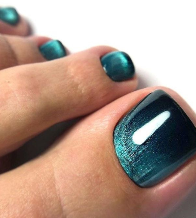 A serene shade of teal brings a calm, collected vibe to these toes. The smooth application and glossy finish suggest a love for the simple pleasures in life. This color is a breath of fresh air, a tranquil hue that can complement any look with a touch of cool sophistication.