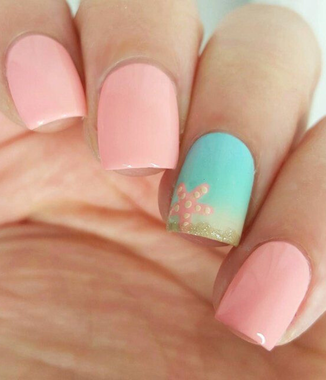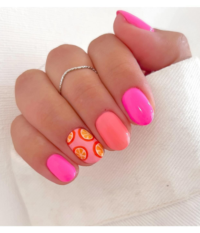 Nothing says summer like the zesty punch of citrus, and this manicure for the fruit lovers out there does just that. Alternating between a pink that’s as sweet as grapefruit and a pink that’s bold as a summer sunset, the standout feature is the orange citrus slice designs that look good enough to eat. It’s a bright, simple design that’s both nice and refreshing, perfect for a summer’s day out or a fruity cocktail evening.