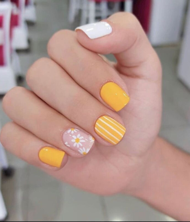 A nod to the clear skies of summer, this manicure showcases a vibrant yellow that’s as bright as the midday sun. Paired with a simple white and adorned with delicate floral art and stripes, it’s a natural choice for a picnic in the park or a backyard brunch. This easy and nice design is a cheerful companion for any simple, airy outfit, adding a splash of color without overwhelming.