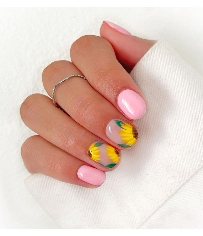 Channel the bright and sunny disposition of summer with this nail design featuring sunflowers. The yellow and green of the sunflowers pop against the pink background, creating a warm and inviting look. This nail art is an ode to the sunflower fields that bloom in the summer, offering a natural, simple, and yet classy look that’s as easy to wear as it is beautiful.