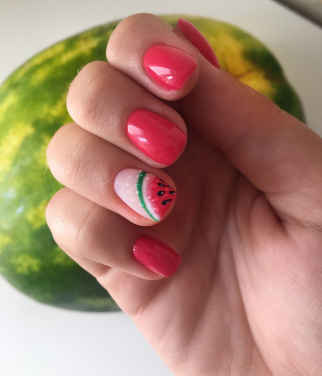 Summer is synonymous with juicy watermelons, and this nail design captures the essence of this beloved fruit. The bright red base paired with the detailed watermelon slice on the ring finger is playful and nice. This manicure for those hot summer days is easy to love and brings an ideas-filled joy to any simple summer dress or casual outfit.