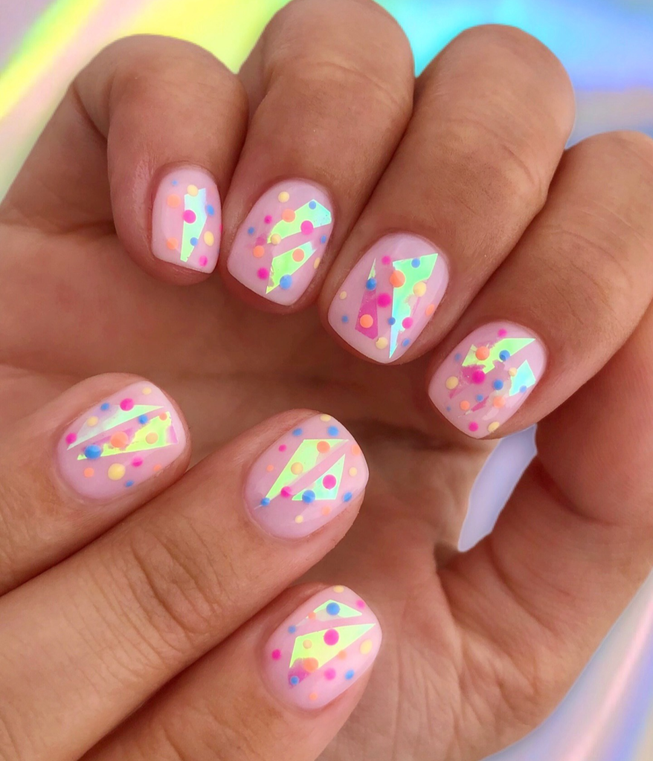 These nails are a celebration in themselves, reminiscent of a sprinkle-topped ice cream under the summer sun. The soft pink base is a canvas for a vibrant confetti of blue, green, yellow, and orange specks, giving an illusion of a joyful burst of color. This nail art is an easy choice for anyone looking to add a splash of fun to their summer look, whether it’s for a beach party or a birthday bash.