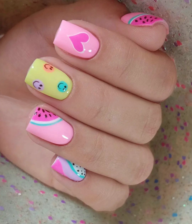 With a nod to the simple joys of summer, this nail design features a pale pink base adorned with adorable smiley faces, each one a different color — from sunny yellow to refreshing green. The watermelon accents, with their pink and green rind, add a nice touch of charm. This easy, natural look is perfect for a vacation or just bringing a smile to everyday life, representing the very essence of carefree summer days.