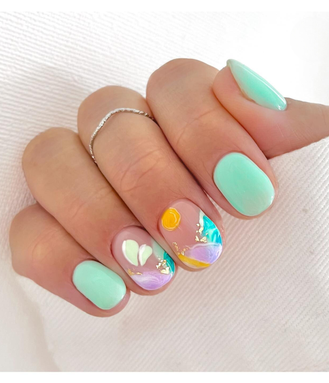 This nail design exudes a soft and feminine charm with its pastel pink and green hues. The gradient effect on the accent nail, adorned with golden polka dots, adds a classy touch of luxury. The simple elegance of this design makes it a versatile choice for both day and night summer events, adding a hint of color while maintaining a natural and understated look.