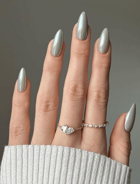 Pushing the boundaries of traditional nude nails, this almond design in a muted silver chrome finish brings a touch of the futuristic into the present. The metallic sheen, combined with the nails’ sharp silhouette, creates an edgy yet elegant aesthetic that would complement any outfit with a modern twist.
