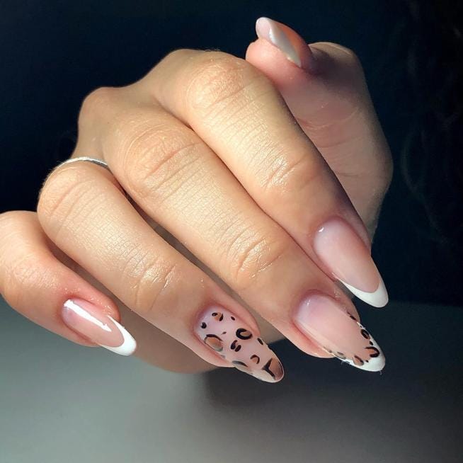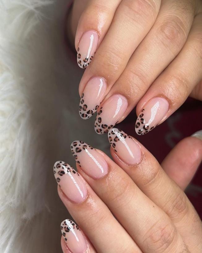 Combining subtlety and style, these nails feature delicate leopard tips on a nude base. The small, intricate spots add just the right amount of wild to the classic French manicure style. This French design is perfect for those who want a more understated yet fashionable look.