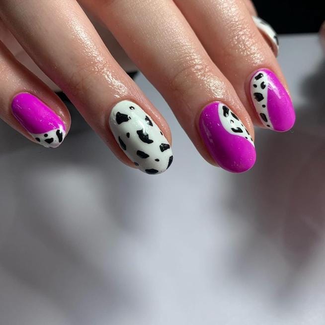 For a minimalist take on animal print, these cow print nails are perfect. The nails feature a white base with black cow spots, creating a clean and modern look. This design is perfect for those who love a simple yet stylish approach to animal print nails.