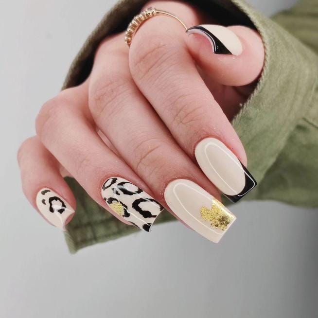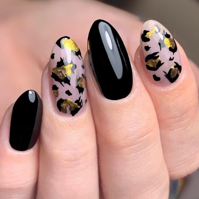 For a touch of opulence, these black and gold leopard nails are ideal. Featuring a blend of black and nude nails with gold leopard spots, this design is both luxurious and stylish. The gold accents add a hint of glamour, making these nails perfect for evening wear or special occasions.