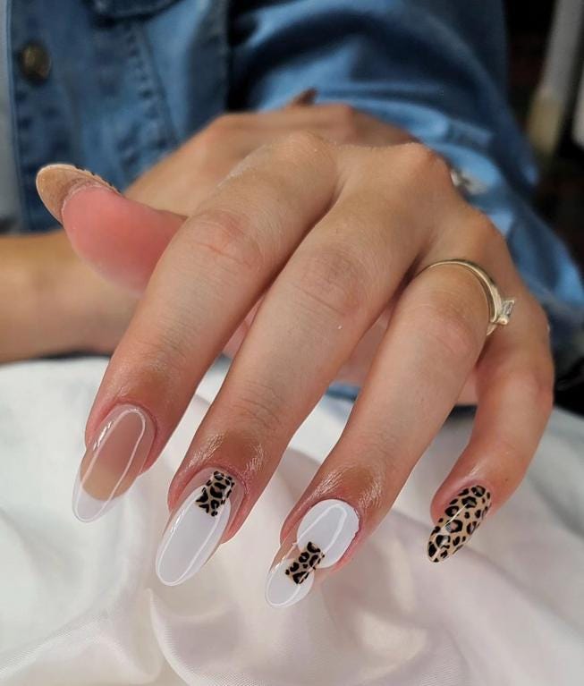 These nails combine a classic white manicure with bold leopard print accents. The nails feature a white base with clear and leopard print accents, creating a chic and modern look. This design is perfect for those who want a subtle yet trendy animal print manicure.