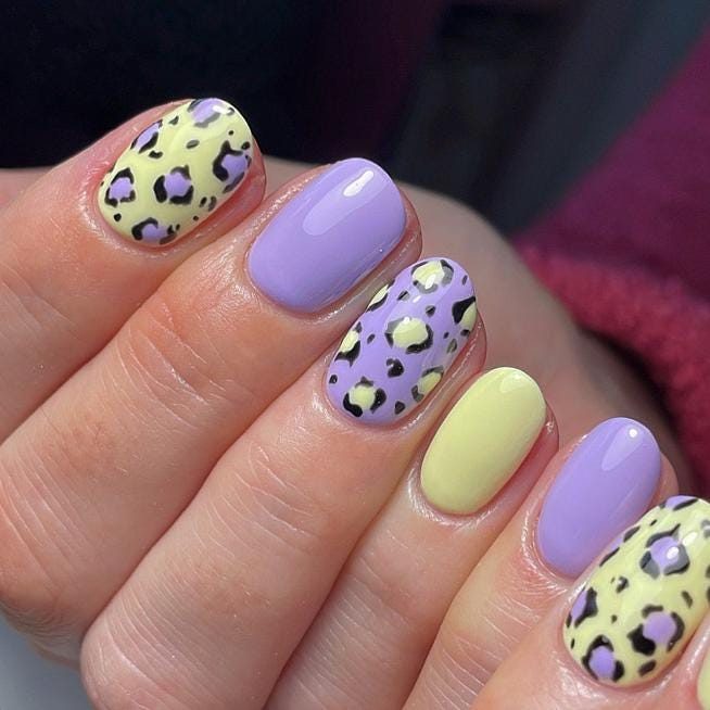 Perfect for spring and summer, these pastel leopard nails feature a mix of soft yellow and lilac with bold leopard spots. This playful art design is ideal for those who love vibrant, cute colors and want to make a statement with their nails. The rounded shape keeps the look feminine and fun, ideal for anyone looking to experiment with nail art.