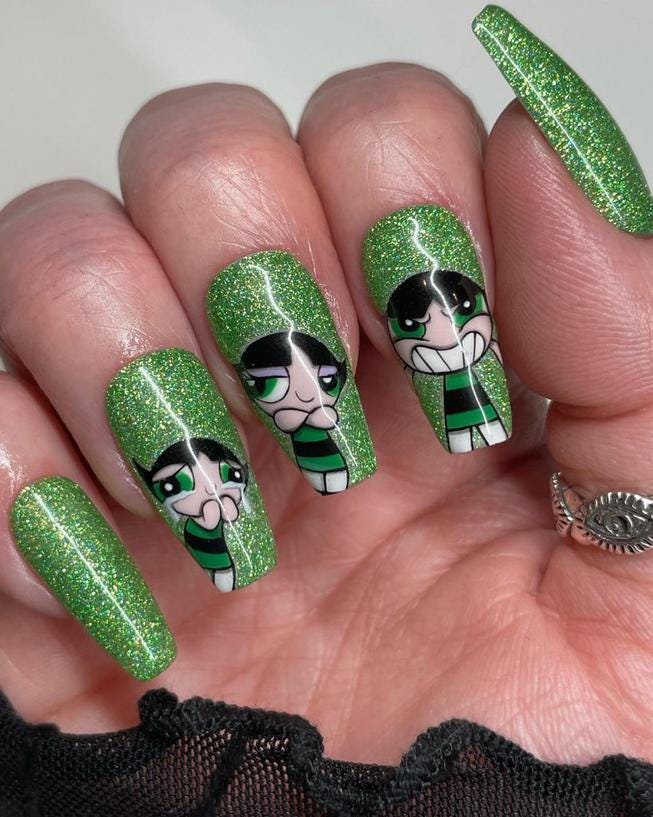 Featuring Buttercup from the Powerpuff Girls, this design uses glittery green polish to make the character stand out. The combination of sparkle and detailed character art creates a lively and eye-catching look. This design is perfect for fans of the Powerpuff Girls who want to add a bit of glam to their cartoon nails.