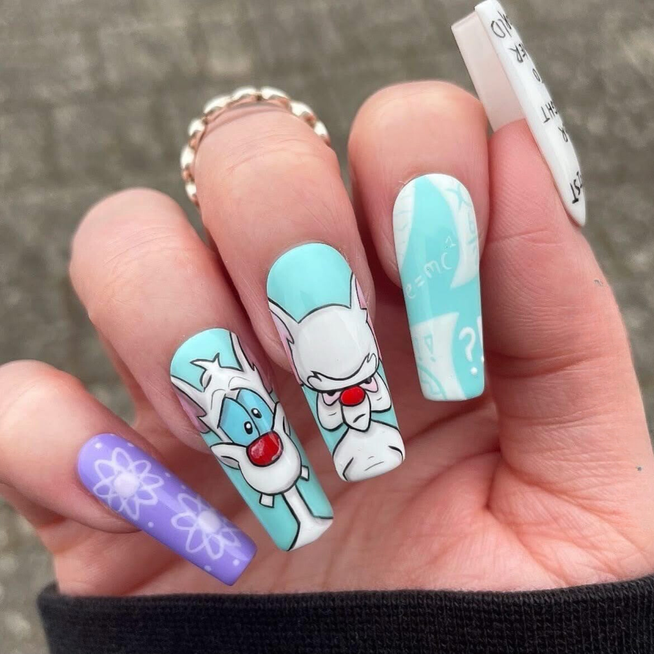 Showcase your love for “Pinky and the Brain” with this fun and detailed nail design. The soft blue and purple tones serve as the perfect backdrop for the iconic duo. The design captures the essence of the characters, making it a perfect choice for fans of the show. This cartoon short nails ideas design is both cute and nostalgic.