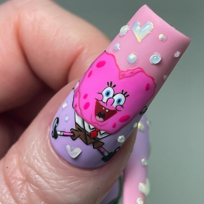 Celebrate love with this SpongeBob heart design. Featuring SpongeBob in a heart shape with pink and purple accents, this design is adorable and playful. The addition of small heart details and a glossy finish makes this design perfect for those who want cute and trendy nails ideas cartoon.