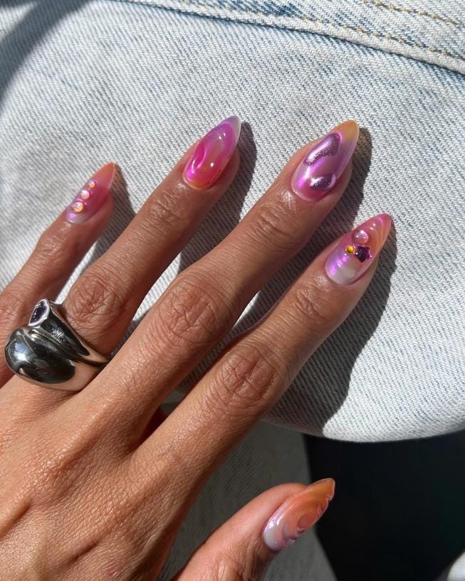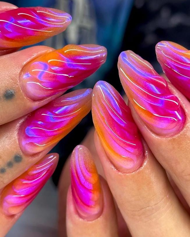 These vibrant nails are inspired by the colors of a sunset, blending bright pinks, oranges, and purples with 3D accents. The shiny, almost iridescent finish adds depth to the colors, making them pop. This bold look is perfect for summer and can be recreated using gel polish for the base colors and builder gel for the 3D details.