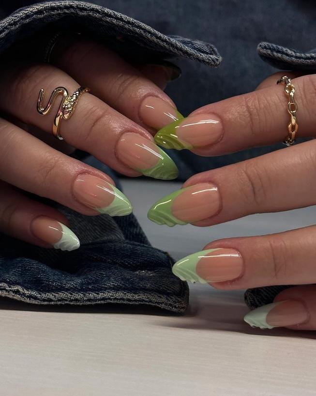 These fresh green nails combine a nude base with vibrant green tips and 3D wave designs. The combination of the natural nude and the bold green creates a striking contrast, perfect for a modern and stylish look. Use gel polish for the base and tips, and builder gel for the 3D waves.