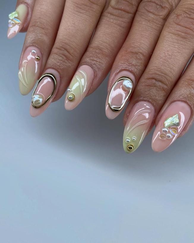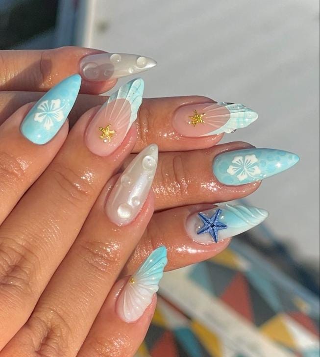 Inspired by the ocean, these nails combine soft blues and nudes with 3D pearl and shell designs. The addition of gold accents adds a touch of luxury to this marine-themed look. Perfect for beach lovers or anyone looking to bring a bit of the ocean to their style, this design can be recreated using gel polish for the base and acrylics for the 3D elements.