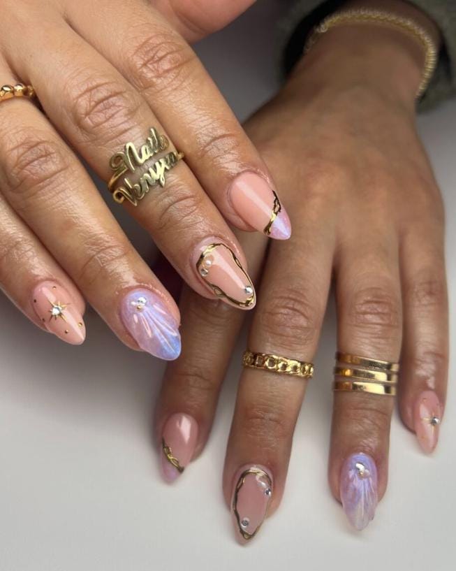 This design combines a nude base with elegant gold accents. The addition of subtle 3D elements like stars and waves gives the nails a luxurious feel without being too overpowering. This look is perfect for those who prefer a more understated elegance. Use gel polish for the base and gold chrome powder for the accents.