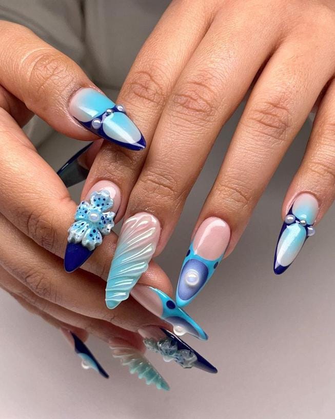 These nails are inspired by the ocean, featuring a gradient of blue shades and intricate 3D details like waves and pearls. The combination of light and dark blues creates a dynamic and refreshing look, perfect for summer. Use gel polish for the gradient base and acrylics for the 3D elements to achieve this design.