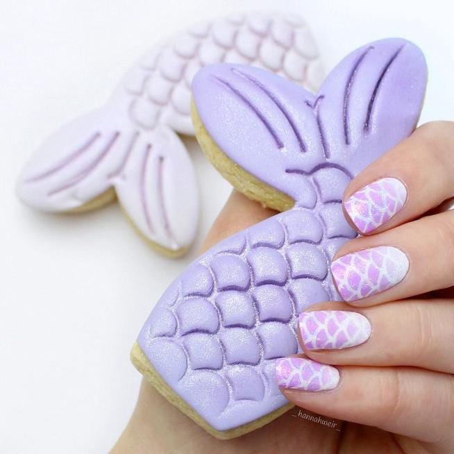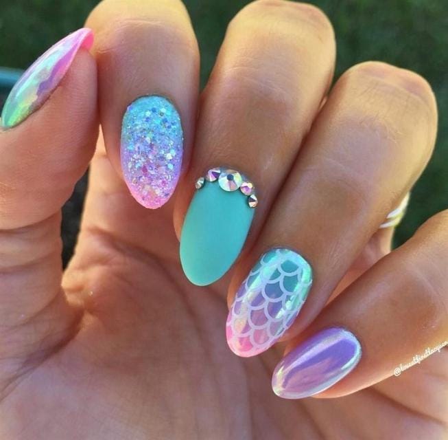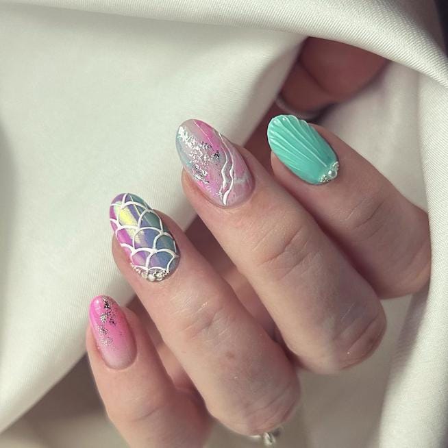 In this design, pastel scales are paired with shimmering accents to create a soft and dreamy look. The use of light pinks, blues, and purples gives the nails a delicate and feminine feel, while the scales add a touch of fantasy. This look is perfect for those who prefer a more subtle approach to mermaid nails. The simple yet intricate designs are ideal for everyday wear and can easily transition to special occasions.