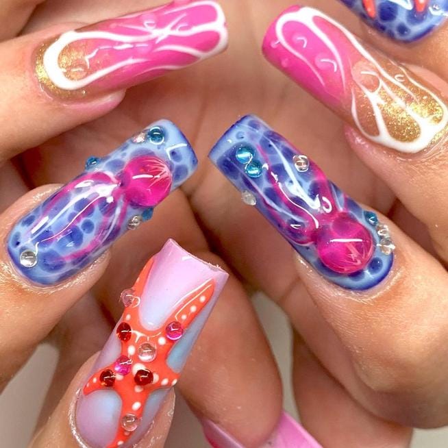 In this vibrant design, bold colors and artistic depictions of sea creatures take center stage. The nails feature detailed octopus and starfish designs, with 3D elements that add depth and texture. The mix of pinks, blues, and golds creates a striking designs perfect for those who love to make a statement with their nails. The use of triangles and lines enhances the overall look, making it truly unique.