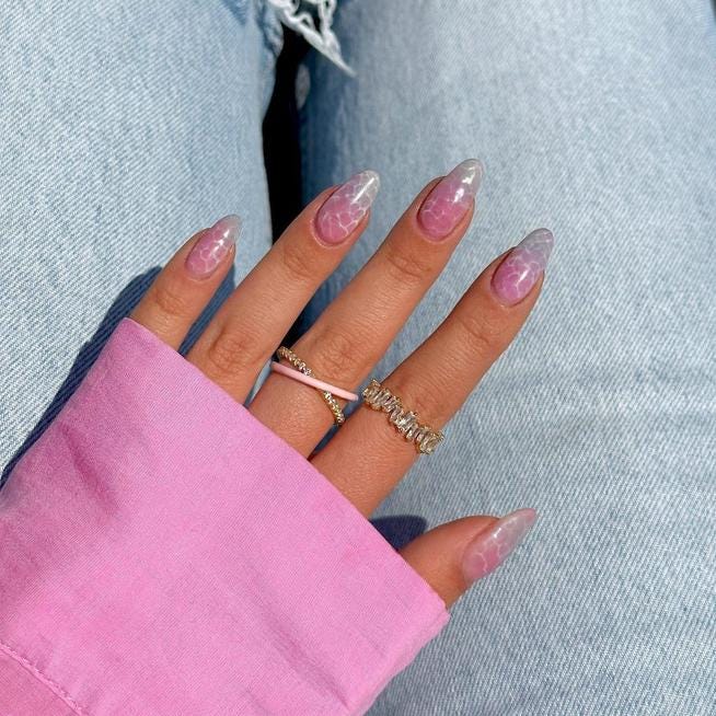 This design features subtle pink scales, creating a soft and feminine look perfect for any occasion. The pink hues are complemented by delicate white scale patterns, adding a touch of elegance. This simple yet chic design is ideal for short nails and is a great example of how lines pink can be used to create a beautiful and understated manicure.