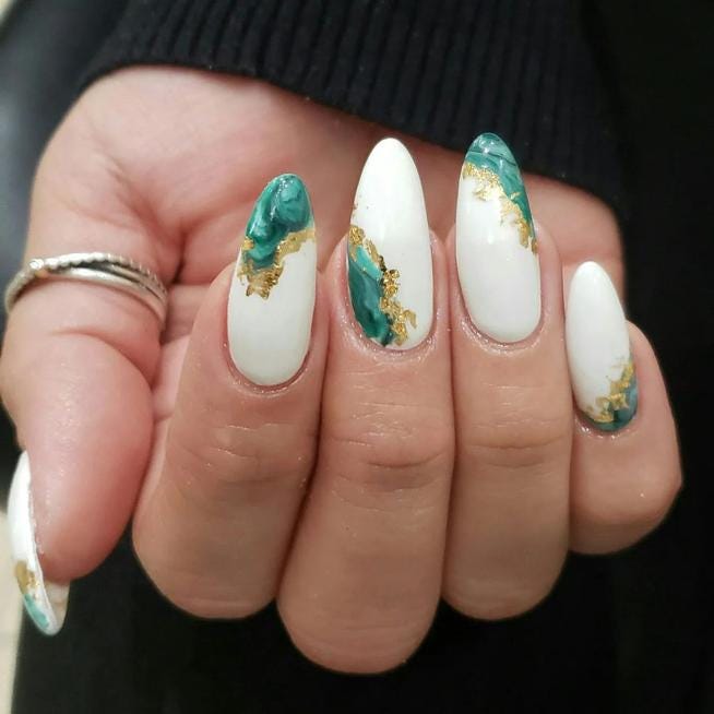 These green marble nails with gold accents are perfect for an elegant and sophisticated look. The deep green base is marbled with gold and white, creating a luxurious design. This look is ideal for special occasions and can be achieved with acrylic or gel polish. The combination of green and gold makes these nails a timeless choice.